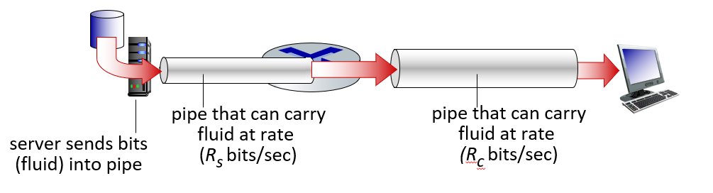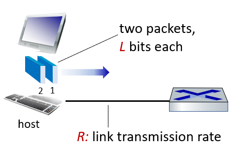 - 전송: 호스트는 이러한 패킷을 접근 네트워크에 전송한다. 여기서 전송 속도 R은 보통 '링크 용량(link capacity)' 또는 '링크 대역폭(link bandwidth)'라고 부르며, 단위 시간당 링크가 수용할 수 있는 데이터 비트 수를 의미한다.