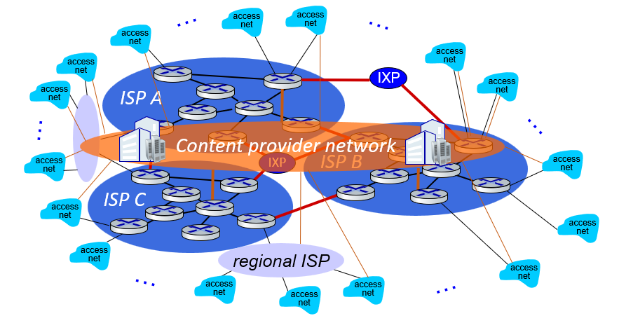 - 콘텐츠 제공자 네트워크: Google이나 Facebook 같은 콘텐츠 제공자도 자체적인 대규모 프라이빗 네트워크를 운영한다. 이런 회사들은 자신의 데이터 센터를 직접 인터넷에 연결하는데, 때로는 지역 ISPs나 심지어 티어-1 ISPs을 우회하기도 한다다. 이렇게 하면 콘텐츠 제공자로부터 사용자까지 데이터 전송 시간을 줄일 수 있다.