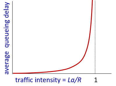 La/R -> 1: 트래픽 강도가 증가함에 따라 평균 대기열 지연이 커진다. 이 경우, 패킷들은 라우터에서 일정 시간 동안 대기해야 한다.