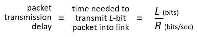 - 전송 지연(dtrans): 패킷을 링크를 통해 전송하는 데 걸리는 시간이다. 달리 말해 패킷을 모두 링크로 밀어넣는데 걸리는 시간이라 할 수 있다. 패킷 길이(L, 비트 단위)와 링크 전송률(R, bps)에 따라 결정된다. 계산식은 dtrans = L/R이다.