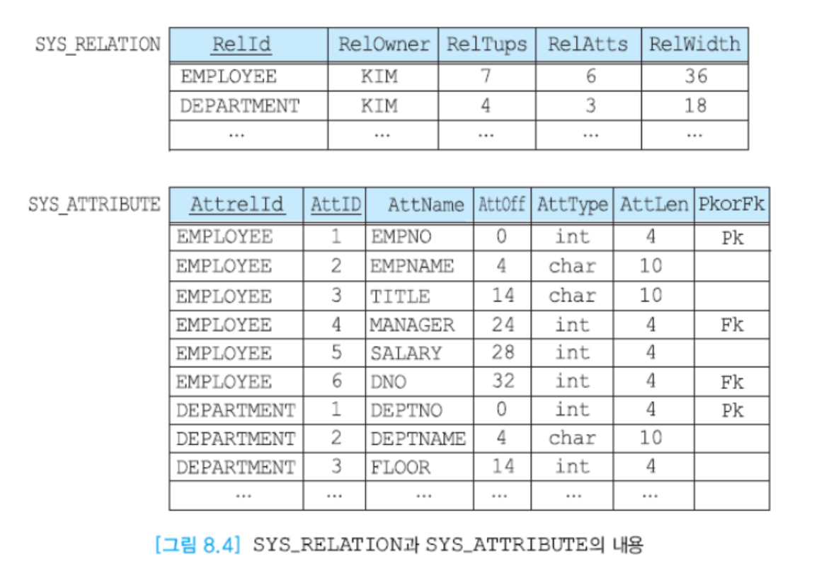 시스템 카탈로그는 시스템 내의 객체(기본 릴레이션, 뷰, 인덱스, 사용자, 접근 권한 등)에 관한 정보를 포함