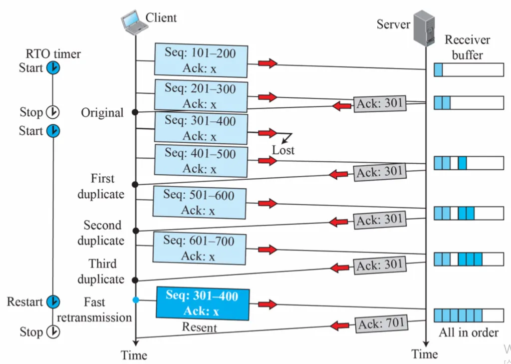 - 클라이언트가 동일한 ACK를 여러 번 수신하면, 타임아웃을 기다리지 않고 손실된 세그먼트를 즉시 재전송한다.