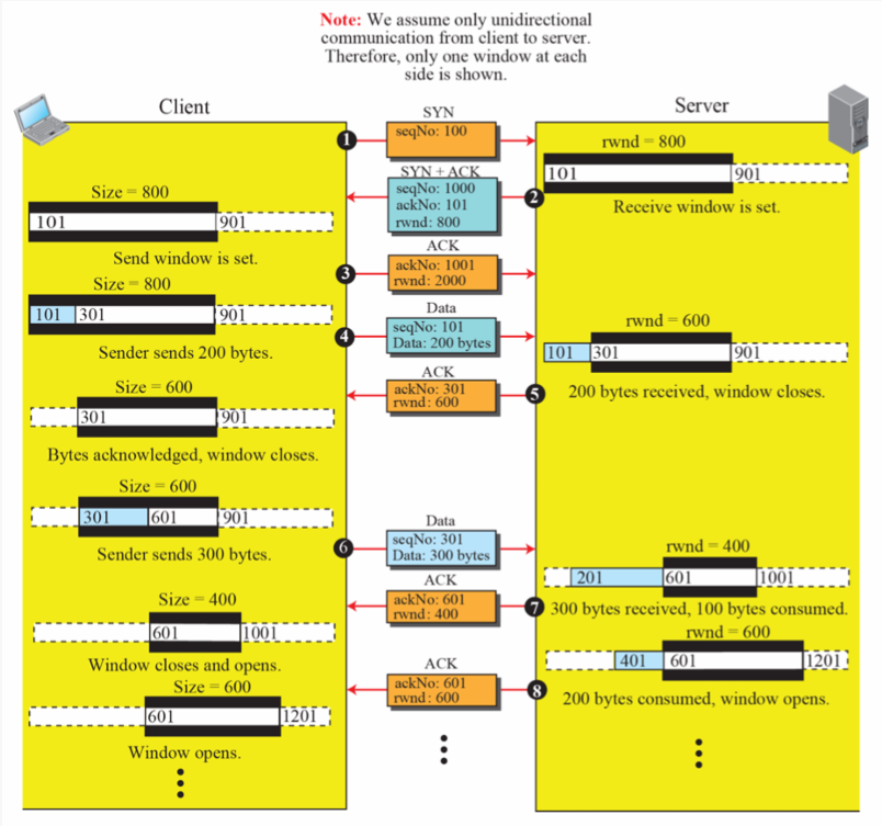 - 연결 설정 단계에서 클라이언트와 서버는 각각 자신의 윈도우 크기(800 바이트)를 설정한다.