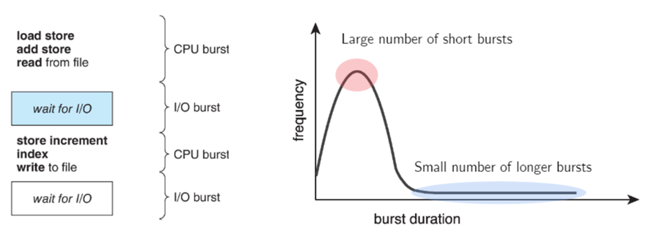 보통 CPU 처리(CPU burst)와 IO를 기다리는 것(I/O burst)이 번갈아 가면서 수행됨