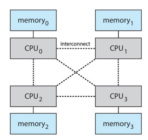 - Numa systems: CPU 각자 memory를 가지고 있어서 자신의 메모리에 접근할 때는 빠르지만 다른 CPU의 메모리에 접근할 때는 느려, 메모리 접근 시간이 일정하지 않은 시스템