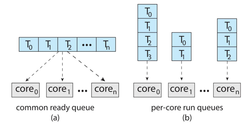 - 하나의 ready queue의 스레드들을 여러 개의 코어들이 실행