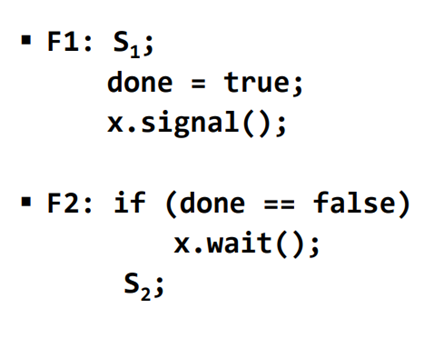 Signal() – 누군가 x라는 condition variable을 다 쓰고 빠져나가면 x라는 조건 때문에 잠들어 있던 프로세스가 있는 경우 그 프로세스 중 하나를 깨워주는 연산