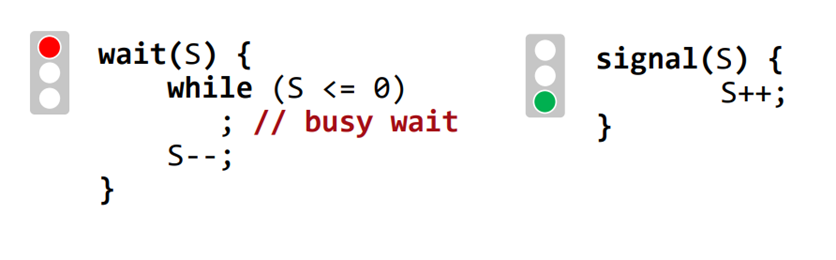 - wait()는 S값이 0이하이면 기다리고 아니면 S를 하나 줄이고 critical section 실행