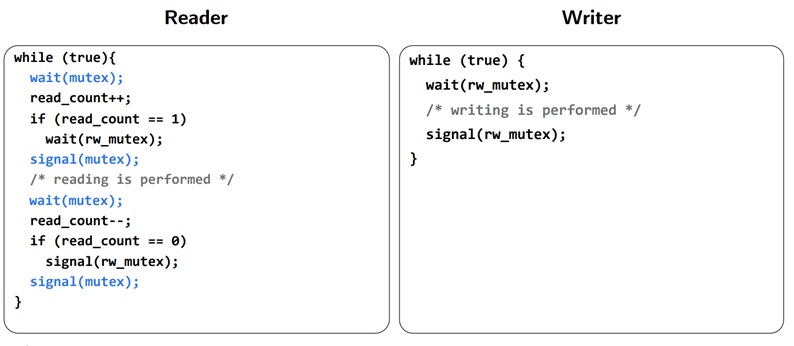 - The first readers-writers problem: reader에게 우선권을 줌(writer가 starvation할 수 있음)