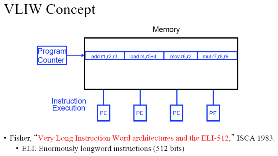 very long instruction word architecture으로 컴파일러가 독립적인 명령어들을 찾아 하나의 VLIW 명령어로 묶는다.