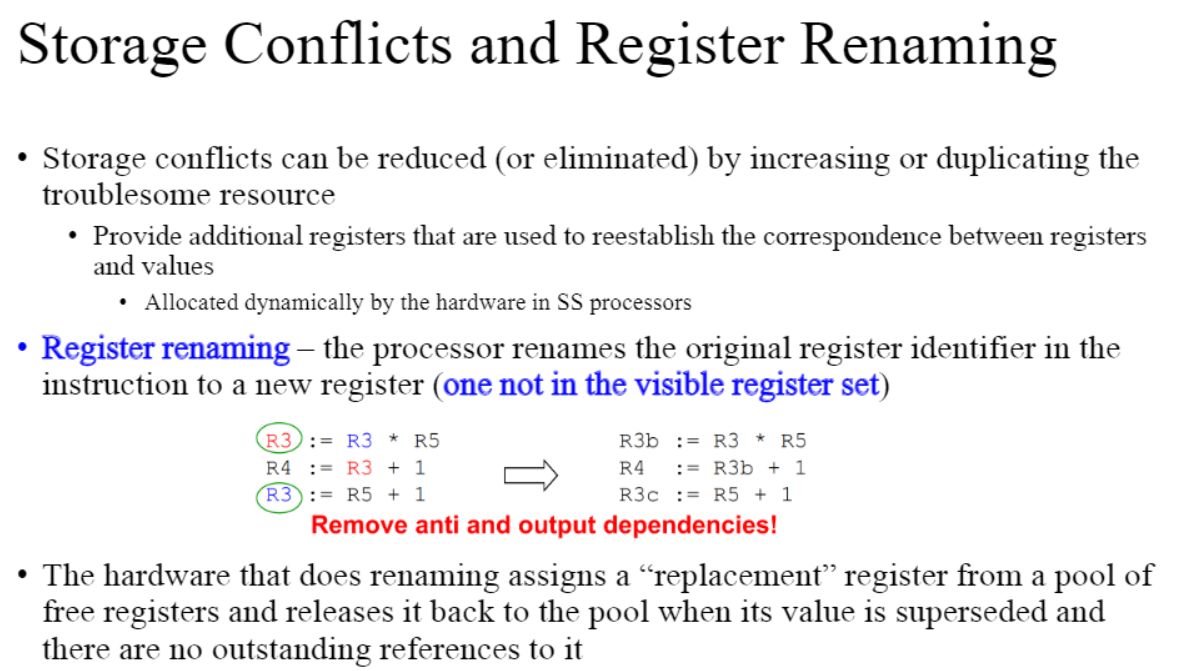 true dependency는 데이터 흐름에 의해 불가피하게 발생한다. antidependency와 output dependency는 레지스터 개수 제한으로 발생하며, 'Register renaming'으로 해결 가능하다.